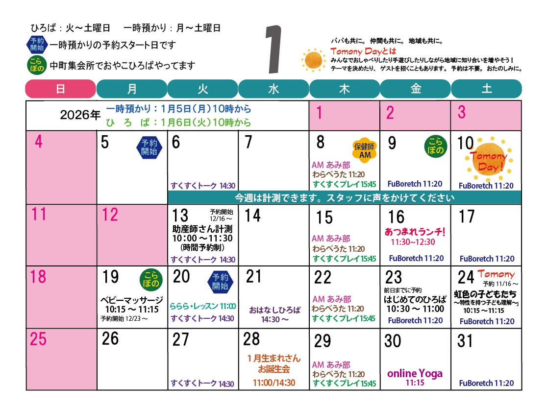 *1月6日(火)〜10日(土)は、体重&身長を測ることができます(予約不要・無料) どのくらい大きくなったかな? すくすく手帳に記録していきましょう。(スタッフが測りますので、母子手帳には記入せず成長の目安としてください)※助産師さんの計測は13日(火)予約制です。