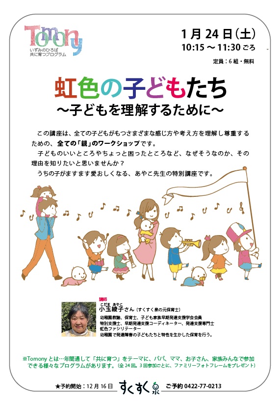 ☆1月24日(土)Tomony『虹色の子どもたち~子どもを理解するために~』(要予約・無料・6組) 講師:小玉綾子(元すくすく泉保育士/発達支援専門士/虹色ファシリテーター) ※予約は12月16日から受け付けます。 0422-77-0213