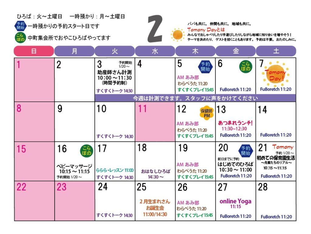 ☆『Tomony Day』 2月7日(土)10:45ごろ~ (予約不要・無料) パパも共に。仲間も共に。地域も共に。共に子育てを楽しもう。この日は10時45分ごろから自己紹介をして、みんなでおしゃべりしたり、手遊びしたり、工作したりして過ごします。テーマを決めたトークや、ゲストを招くこともあります。ぜひご家族そろって遊びに来てください。