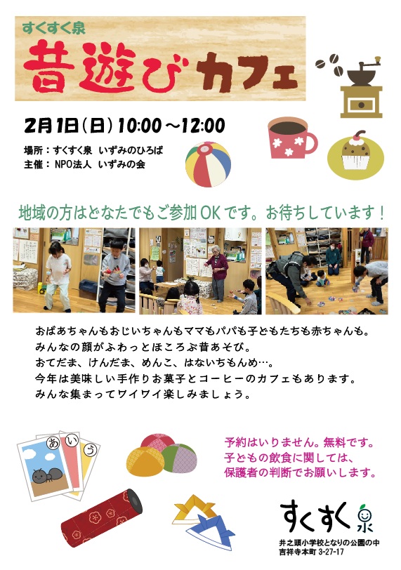 ◎「昔遊びカフェ」すくすく泉にて 2月1日(日10:00~12:00) ※予約不要・無料 お手玉、メンコ、けん玉など、昔の子どもたちが楽しんだ遊びを、地域のおじいちゃん、おばあちゃんたちと一緒に楽しみましょう! この日は小中学生や、地域のどなたでもご参加ください。今年はおいしいコーヒーや手作りお菓子もありますよ。パパもママも楽しい昔遊びの日。ぜひお立ち寄り下さい。